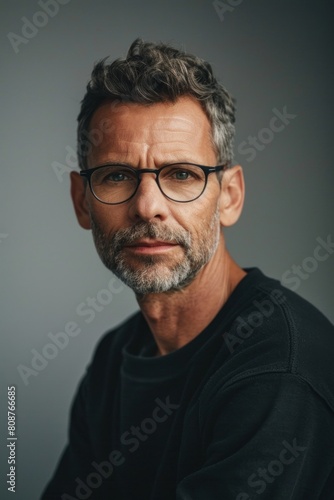Close-up portrait of a stylish mature man with glasses against a gray background