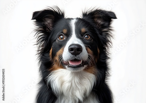 close-up portrait of a tricolor dog with fluffy ears and bright eyes looking happy and alert against a white background