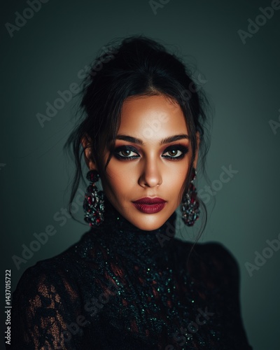 portrait, person, closeup, dark green, dark hair, wavy hair, red lipstick, blacktop, textured, shimmer, sequin, glistering, ornate, dramatic, sophisticated