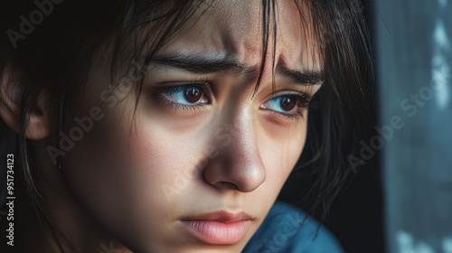woman, portrait, closeup, face, eye, frown, young, expression, dark, hair, blue, brow, furrowed, skin, light, shadow, sharpened, pensive, thoughtful, serious, concerned, sad, upset, melancholy, emotion, feeling, inner, struggle, human, realism, natural, beauty, photo, art, image, photo, digital, artistic