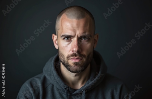 Close-up portrait of unshaved man in hoodie with bold look. Confident guy with serious expression, charisma, photogenic appearance, unshaved head, stubble beard. Model posing in studio with dark