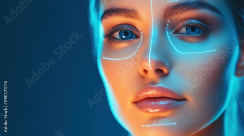 woman, portrait, beauty, skincare, cosmetic, blue eye, facial features, aesthetic, lighting, neon, closeup, shine, wellness, health, youthful, radiant, make-up, contour, art, elegance, modern, style, confidence, serene, tranquil, creativity, inspiration, charme, delicate, smooth skin, calmness, artistic, facial expression, glowing, captivating, nature, harmony, fashion, allure