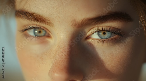 woman, girl, female, portrait, face, eye, blue eye, freckle, skin, complexion, closeup, macro, beauty, model, young, teenage, sunlight, natural light, light, shadow, detail, texture, expression, gaze, look, iris, eyelash, eyebrow, make-up, cosmetic, healthy, vibrant, bright, innocence, purity, serenity, calm, peaceful, summer, spring, fresh, delicate, soft, sharpened, sharp, photo, image, picture