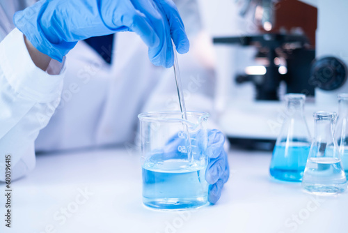 Closeup scientist hand using stirring rod for stirring blue liquid solution glass beaker chemical chemistry research science experiment test laboratory, scientific medicine technology lab analysis