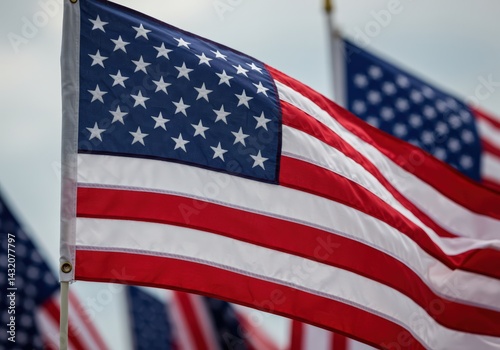 Close-up shot captures a waving American flag with vivid stripes and stars against a cloudy sky.