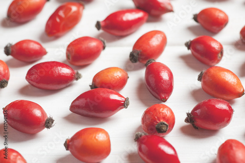 Close-up shot od rosehip berries on a wooden table, light toning