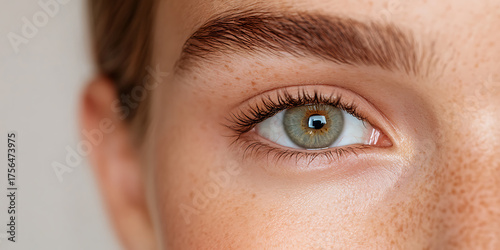 Close-up shot of a green eye with long lashes and detailed eyebrow, showcasing natural skin texture with freckles. Focus on beauty and eye health.