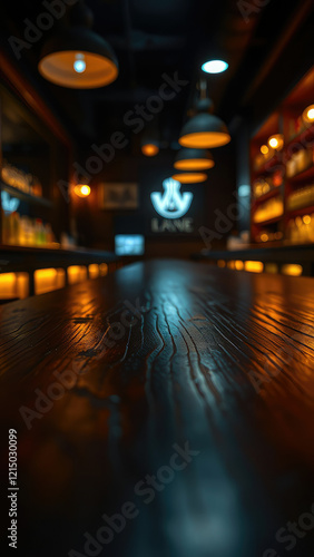 Close-up shot of a wooden table with a soft-focus bar ambiance, exclusive, premium