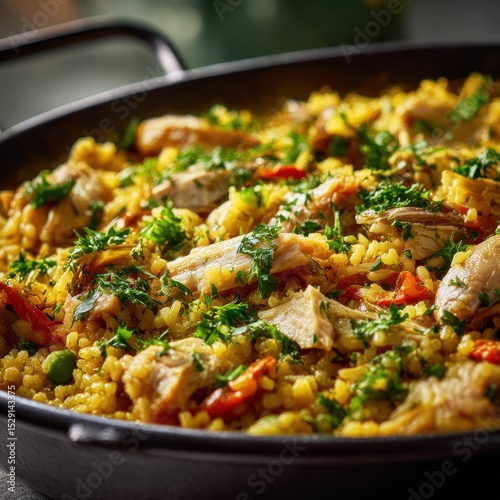 closeup shot ready to serve arroz de aves food photography gourmet vibrant fresh ingredients razor shallow clean background