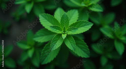Close-up top view of vibrant green mint plant leaves. Lush foliage perfect for nature, health, and wellness themed projects.
