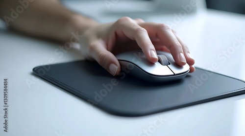 close-up, top-down view: A relaxed, pale-skinned hand with trimmed fingernails and a few scattered hairs on the back, rests naturally on a sleek, silver computer mouse with a subtle sheen, while worki