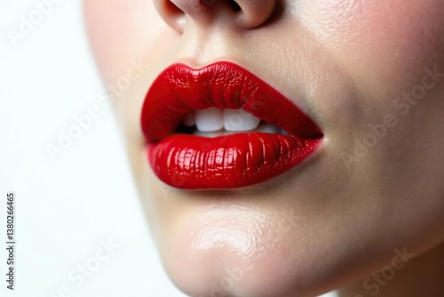 Close-up vibrant red lips, stark white backdrop, coral, feminine