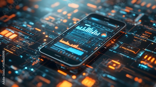 smartphone, device, circuit, board, technology, screen, datum, information, digital, graphic, interface, display, futuristic, modern, light, glowing, orange, blue, black, overlay, pattern, tech, electronic, network, connection, analysis, graph, chart, communication, innovation, future, design, detail, close, up, visualisation, abstract