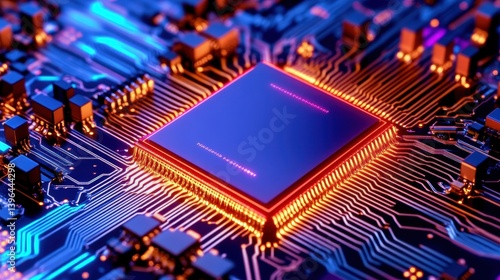 Close-up view of a vibrant microchip on a circuit board with glowing connections and intricate details