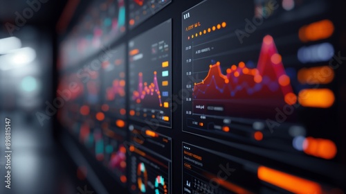 Close-up view of a wall of data displays with charts and graphs in a modern office