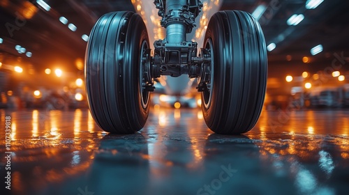Close-up view of an aircraft's landing gear on a shiny tarmac with glowing lights in the background.