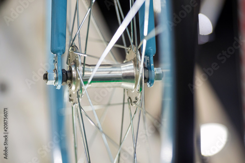 Closeup view of blue road bicycle axle(bicycle spindle) with blurry background