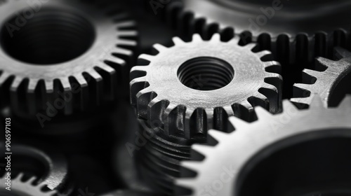 Close-up view of interlocking metal gears in black and white. Suitable for illustrating mechanical engineering, industrial design, and machinery concepts