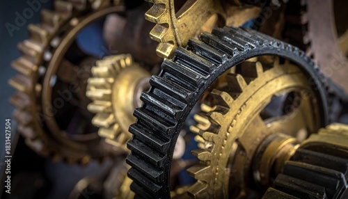 gear, machinery, metallic, gold, black, detail, closeup, engineering, technology, part, mechanical, precision, interlocked, industrial, movement, working, system, machine, structure, texture, surface, pattern, complex, automation, design, assembly, production, process, manufacturing, equipment, component, connection, worked, network, synergy