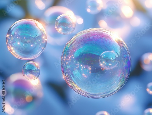 Closeup view of iridescent soap bubbles floating against light blue background. Bubbles display vibrant colors. Light refraction, reflection apparent on bubble surfaces creating mesmerizing effect.