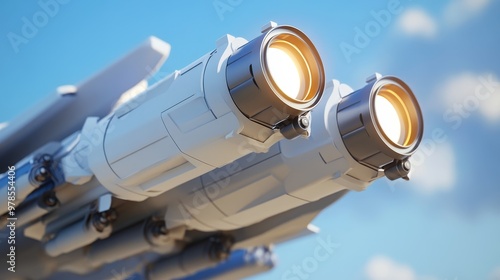 Close-up view of rocket engines highlighting their intricate design and powerful thrust capabilities against a clear blue sky.