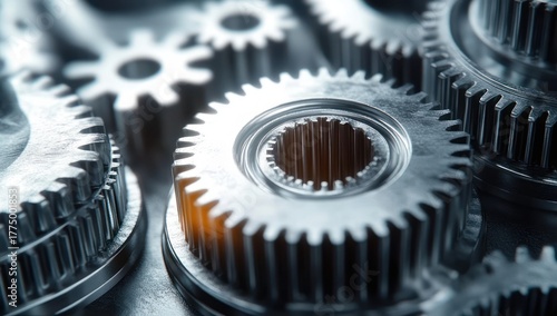Close-up view of shiny interlocking metal gears in a mechanical system with subtle lighting highlights