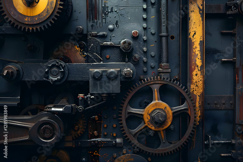 Close-up view of vintage machinery gears and mechanisms with rust and wear, showcasing industrial design