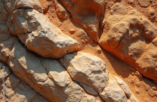 Close-up view of weathered tan rocks and sandy soil, showing cracked textures and deep shadows. Natural geology pattern offers background for earth science or desert themes.
