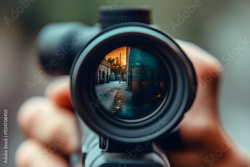 scope, rifle, sight, lens, view, city, street, urban, sunset, building, alley, architecture, target, sharpened, aiming, vision, perspective, hand, weapon, optic, military, security, hunting, precision, detail, image, photo, photo, picture, background, texture, design, illustration, graphic, element, tool, gear, equipment, object, item, technology, device