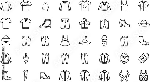 clothes, icon, clothing, vector, illustration, fashion, shirt, white, isolated, dress, design, background, t-shirt, black, symbol, hanger, blank, store, silhouette, casual attire, textile, collection, pant
