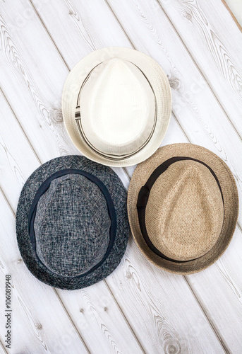 apparel, table, garment, hat, textile, fabric, style, stylish, clothing, clothes, elegant, design, lifestyle, shirt, blouse, short, wood, wooden, background, object, concept, summer, season, day, daylight, vertical, indoor, closeup, from above, nobody, colourful, accessory