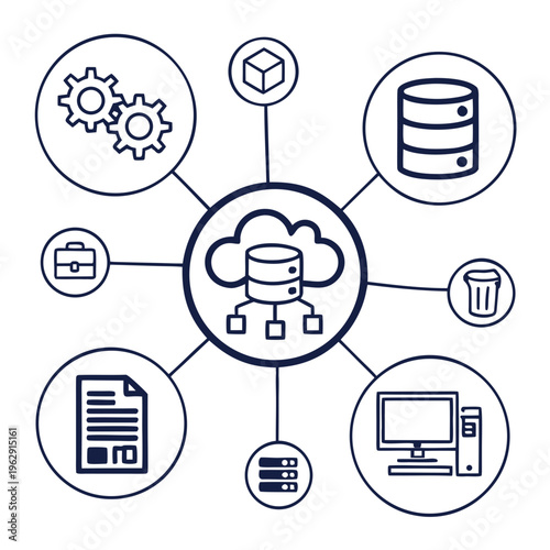 cloud, computing, icon, gear, cube, database, briefcase, document, computer, server, trash, network, technology, software, hardware, datum, storage, connection, system