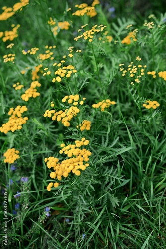 Clusters of small yellow wildflowers growing amidst green grass in a vibrant summer meadow, showcasing natural beauty and fresh foliage.