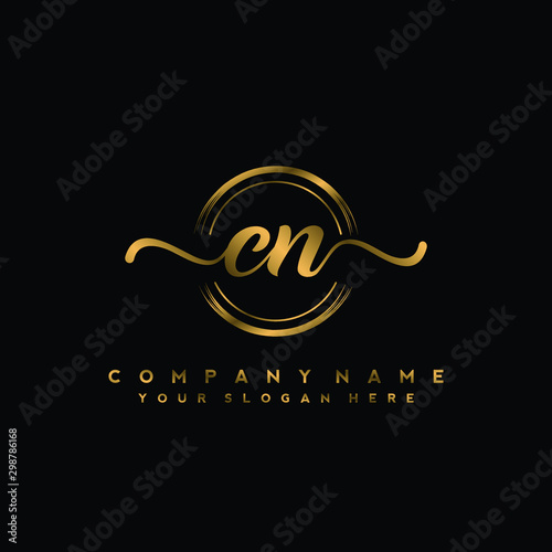 CN Initial handwriting logo design with golden brush circle. Logo for fashion,photography, wedding, beauty, business