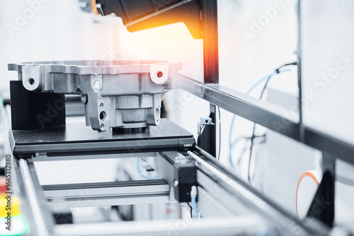 Cnc coordinate measuring machine inspecting metal component in industrial conveyor