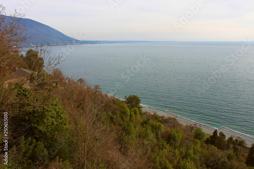 sea, black sea, coast, autumn, abkhazia, background, beach, blue, branch, bush, cloud, cloud, foliage, forest, green, high, horizon, landscape, mountain, nature, rock, scenery, scenic, shore, sky, tree, view, water
