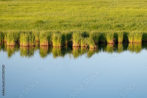 Coast of the river at sunset. Smooth water surface with grass reflection. Bright image with green reed plants reflected in the mirror smooth water surface of a small river