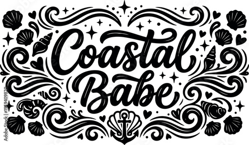 Coastal babe hand lettering with shells anchor and waves vector art