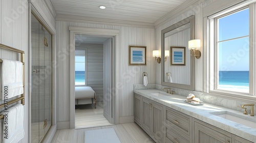 coastal, bathroom, whitewashed, wood, seashell, accent, soft, blues, bright, daylight, interior, design, decor, beach, theme, serene, peaceful, relaxing, style, natural, element, ocean, inspired, rustic, light, airy, idea, neutral, tone, sunlight, contemporary, elegant, modern, stylish, house, retreat, simple, clean, fresh, living, bathe, home, luxury, sink, room, mirror, shower, architecture