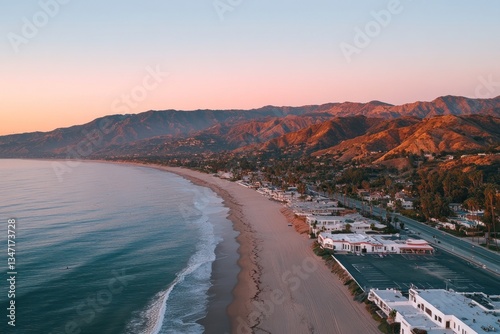 aerial, beach, sunrise, california, coast, ocean, town, mountain, scenic, view, drone, landscape, vacation, travel, tour tourism, sunset, photo, nature, beautiful, stunning, gold, horizon, morning, tranquil, calm, picturesque, us