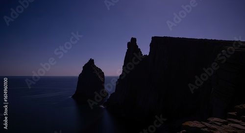 night, sea, landscape, coast, cliff, rock formation, ocean, dark, nature, calm, serene, tranquil, sky, blue, silhouette, water, coastal, scenic, travel, vacation, tour tourism, geology, geologic, island, landmark, headland, headland, long exposure, photo, night photography, evening, dusk, horizon, outdoors, adventure, seascape, remote, hidden, dramatic, impressive, majestic, coastline