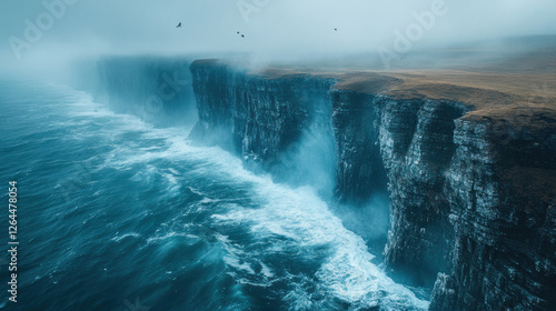 Coastal cliffs with dramatic waves crashing below and seabirds soaring in the wind