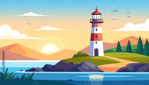 lighthouse, sunset, ocean, coast, sea, landscape, beach, rock, mountain, hill, sky, cloud, nature, sunrise, summer, travel, vacation, scenic, view, beautiful, picturesque, tranquil, calm, peaceful, serenity, water, horizon, illustration, graphic, design, vector, artwork, background, banner, postcard, seascape, coastal, shoreline, school, business, marketing, learning
