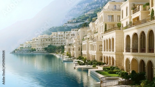 Coastal luxury villas, Mediterranean architecture, serene waterfront, mountains in background