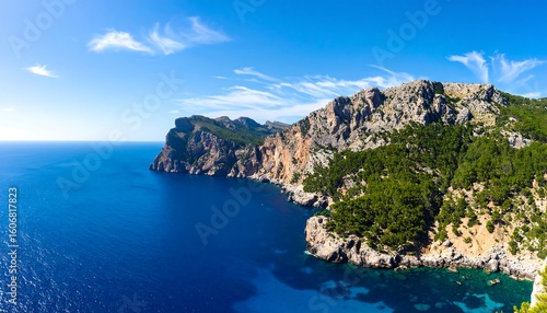 coastal, panorama, cliff, mountain, ocean, blue, water, sky, cloud, green, lush, vegetation, rock, sunny, landscape, scenic, mediterranean, view, nature, travel, vacation, dramatic, horizon, tranquil, elevated, perspective, sharp, detail, wide, huge, expansive, image, photo, seacoast, coastline, island, pine, tree, bright, daylight, summer, beautiful