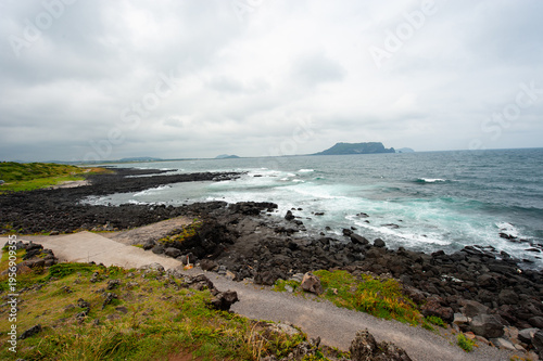 Coastal Scenery of Jeju Island with Far View of Sea and Seongsan Ilchulbong Sunrise Peak