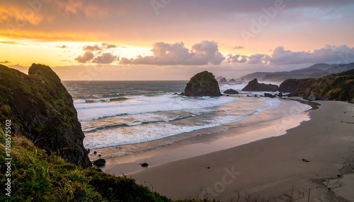 Coastal sunset, dramatic cliffs, sandy beach, waves