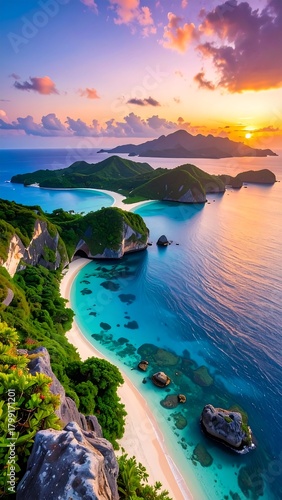 Coastline with tropical islands and a colorful sunset, taken from an aerial perspective