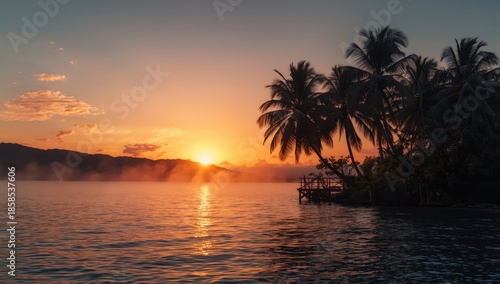 Coconut trees shadowed against a sunset sky with ocean background, suitable for tourism promotion materials