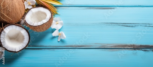 Coconuts and flowers sit on a vibrant blue wooden table next to a window overlooking a swimming pool. The circular shapes contrast with the linear grain of the wood, creating an artistic display